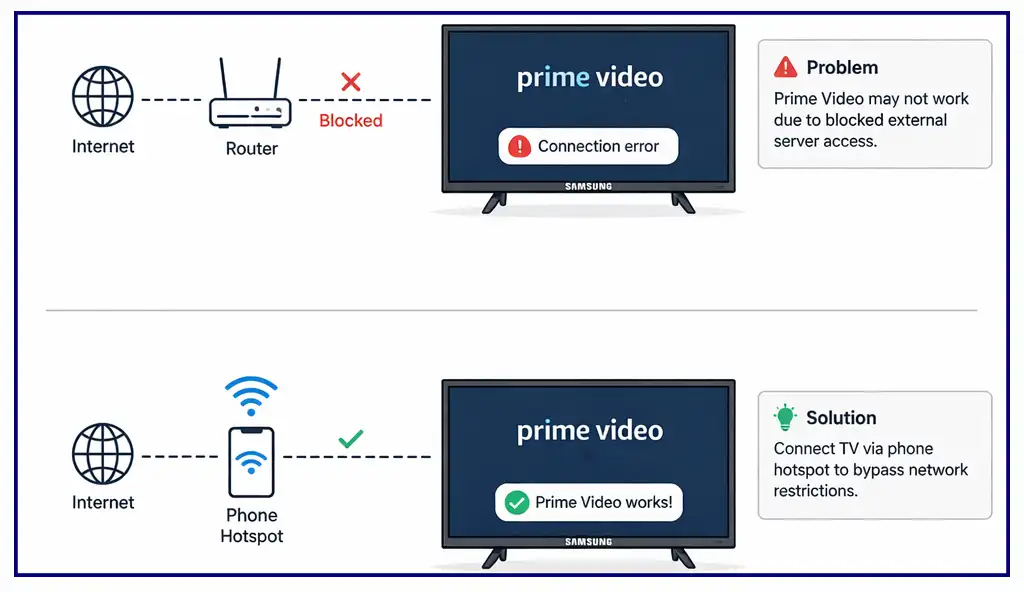 ネットワークが原因かどうかを確認するには、別のインターネット接続を使用してテレビを接続してみてください。例えば、スマートフォンでホットスポットを有効にし、家庭のルーターではなくその接続にテレビを接続します。その後、再度Prime Videoを起動します。