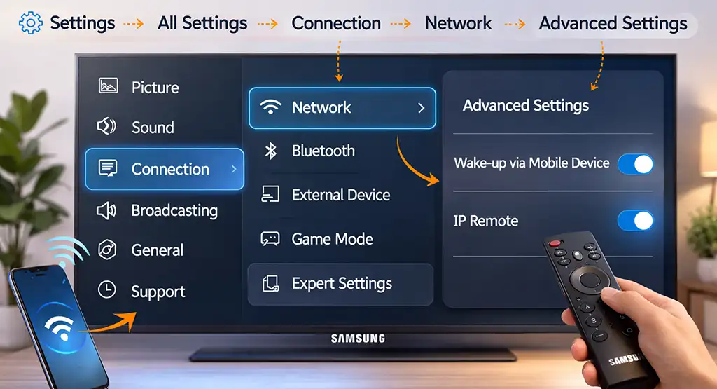 「Wake via Mobile Device」 を有効にするには、「設定」→「すべての設定」→「接続」→「ネットワーク」→「詳細設定」 に進み、このオプションをオンにします。「IP Remote」 は同じメニューから有効にできます。