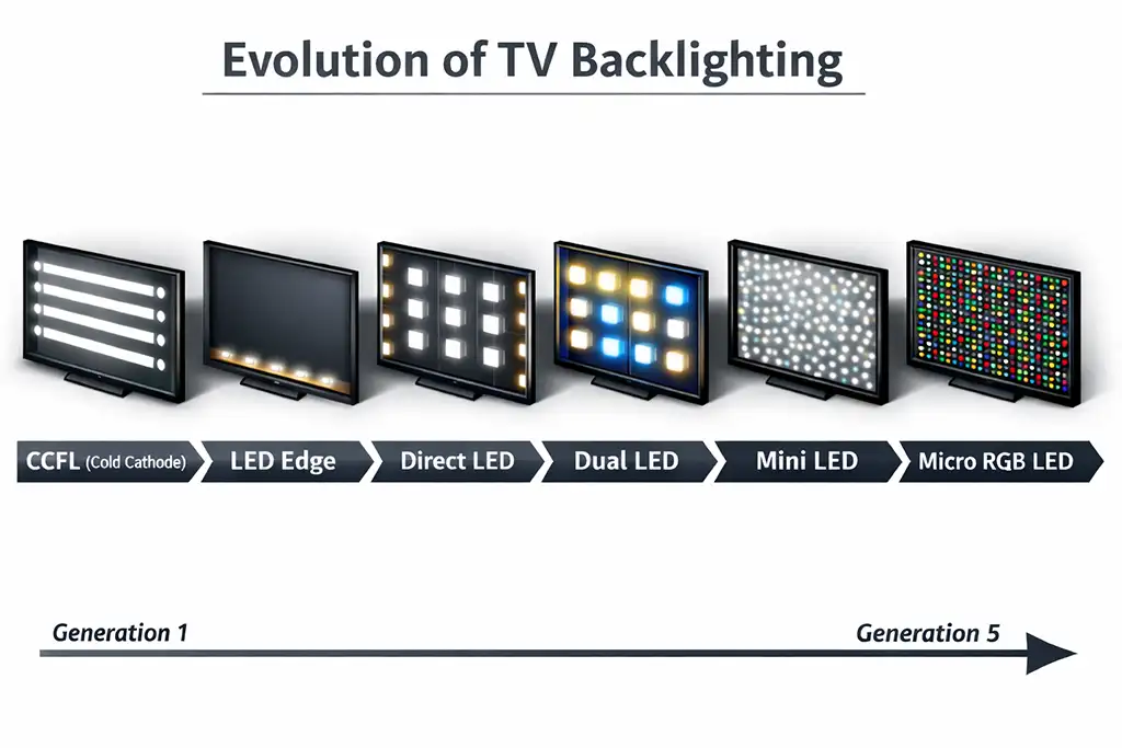 Micro LEDバックライトは、テレビのバックライト技術が継続的に進化してきた結果であり、この流れの第5段階と位置づけることができる。第1世代では冷陰極蛍光ランプ(CCFL)が使用されていた。その後、LED Edgeバックライト、次にDirect LEDが登場した。さらに、バックライトに青色LEDを追加したDual LED方式が現れた。次の段階がMini LED技術で、大型LEDを小型LEDに置き換えることで光源数を増やし、輝度制御を向上させた。そしてMicro LEDバックライトが次のステップとなり、赤・緑・青の3つの独立したLEDを使用する。